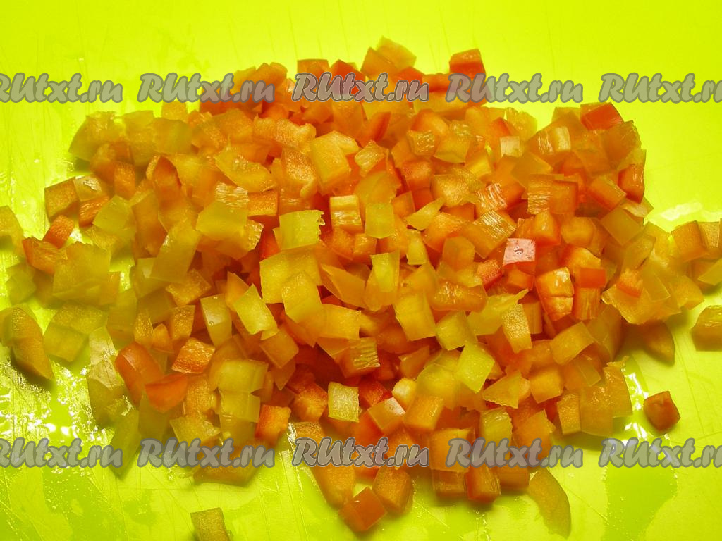 Болгарский перец моем, очищаем от семян и нарезаем маленькими кубиками.