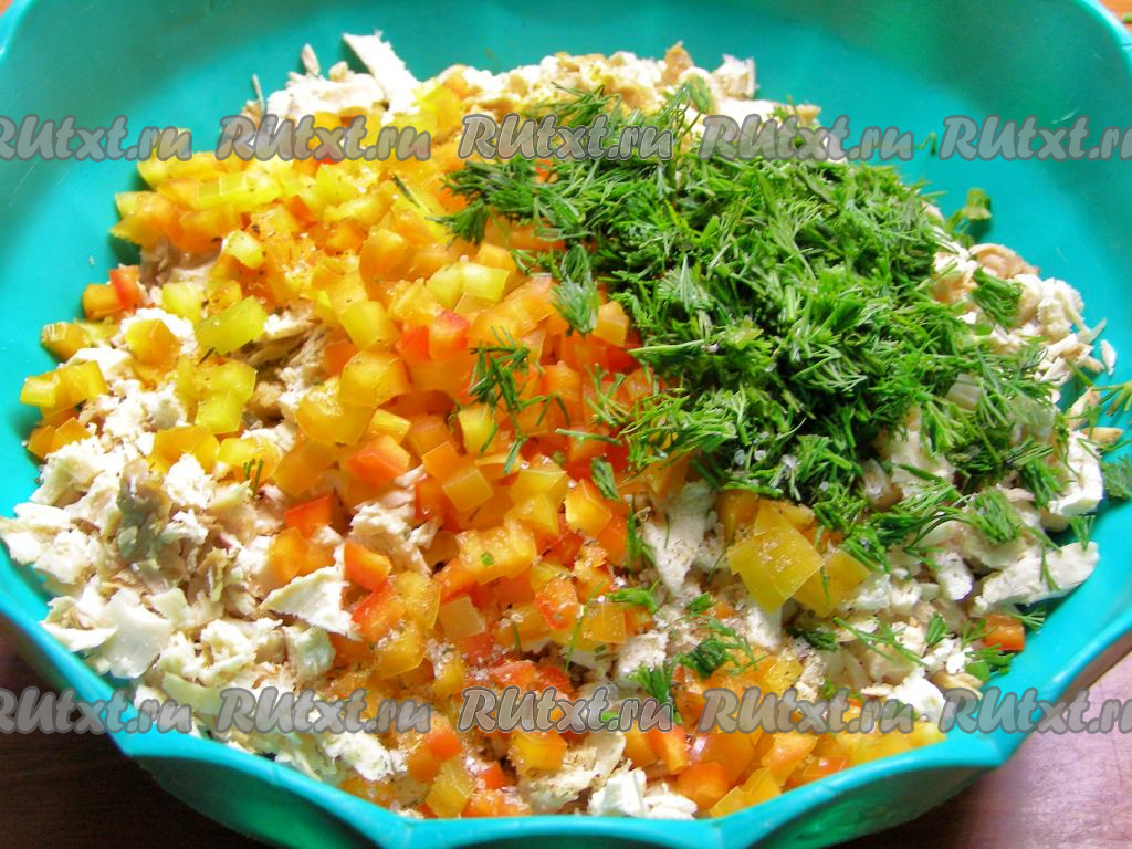 В миску перекладываем нарезанное куриное мясо, болгарский перец, укроп, добавляем 1 чайную ложку соли (я использовала адыгейскую), по вкусу можно немного поперчить, хорошо перемешиваем.