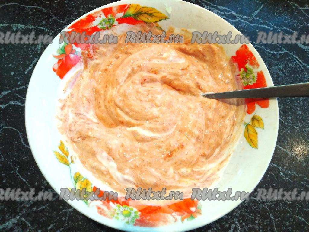 Подготовим заправку для икры, для этого соединяем в мисочке майонез, чёрный молотый перец, томатную пасту и чеснок, выдавленный через пресс, перемешиваем до однородности.