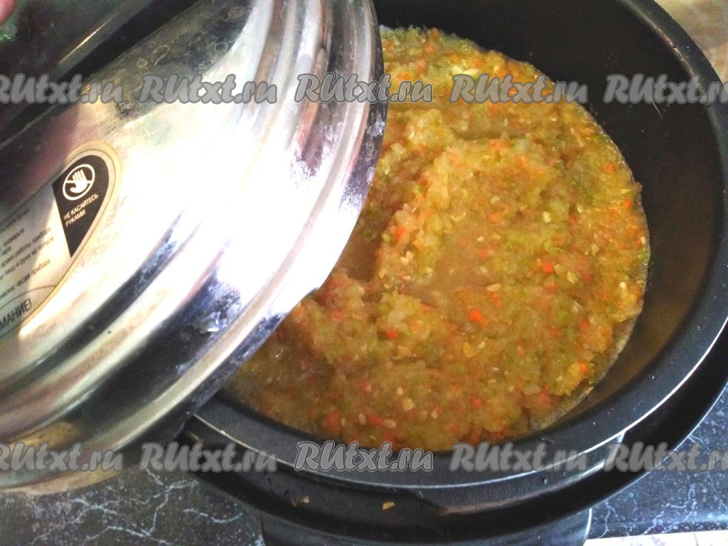 Готовим кабачковую икру 1,5 часа на режиме "Тушение", закрыв крышку мультиварки и немного приоткрыв клапан для выхода пара.
