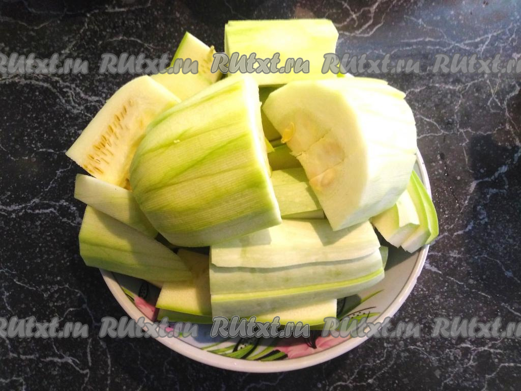 Сначала моем кабачки, очищаем от кожицы (если семечки очень крупные, их тоже желательно убрать) и нарезаем такими кусочками, которые влезут в отверстие вашей мясорубки.