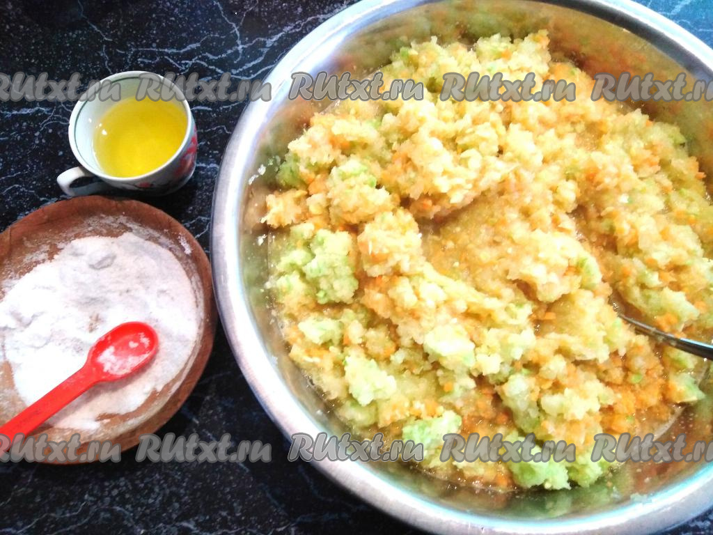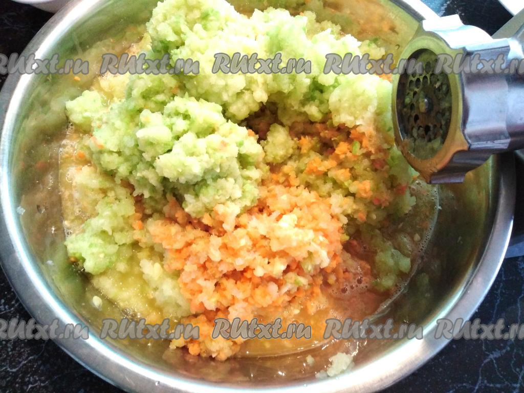 Перекручиваем морковь, кабачки, лук и перец через мясорубку (желательно использовать решётку с мелкими отверстиями).