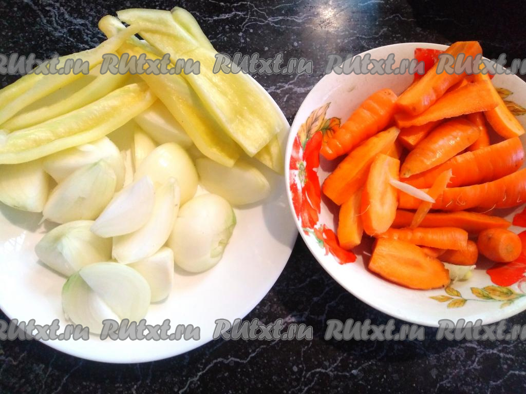 Затем моем и очищаем морковь, лук, удаляем семенные коробочки из болгарского перца. Нарезаем лук, перец и морковь так, чтобы они поместились в отверстие вашей мясорубки.