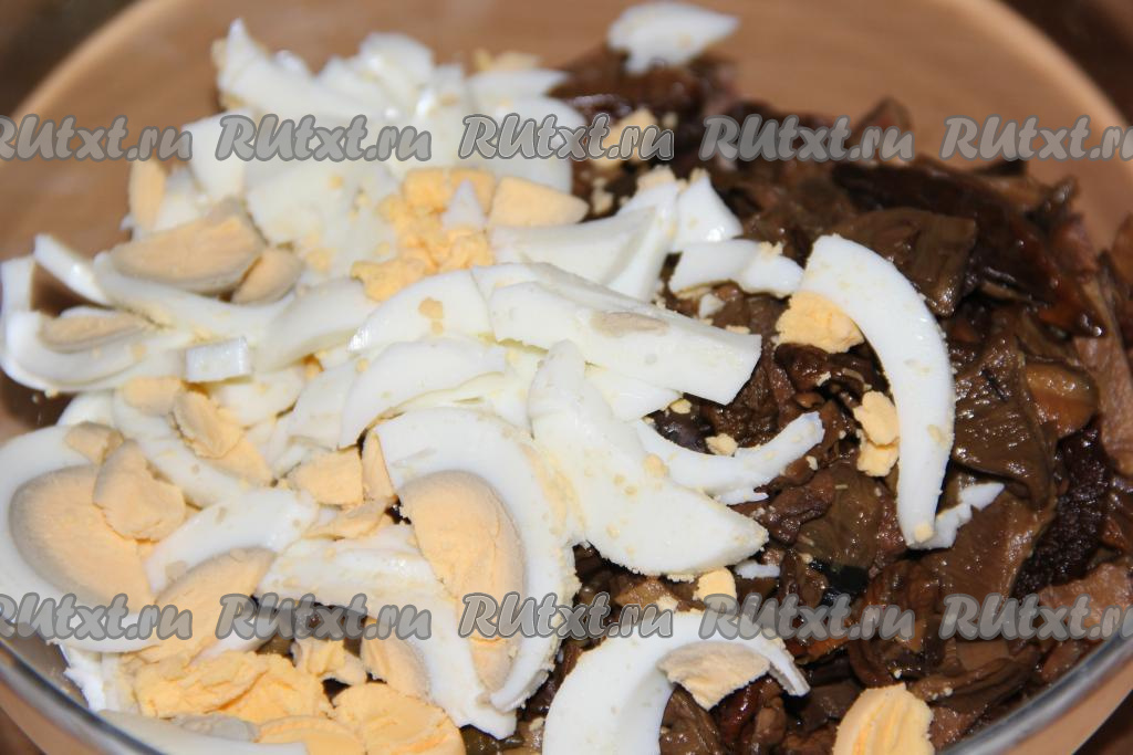 Яйца сварить в течение минут 8-10 с начала кипения воды. Варёные яйца остудить, почистить, нарезать (мелко резать не нужно) и выложить в салат из грибов и свиного сердца.