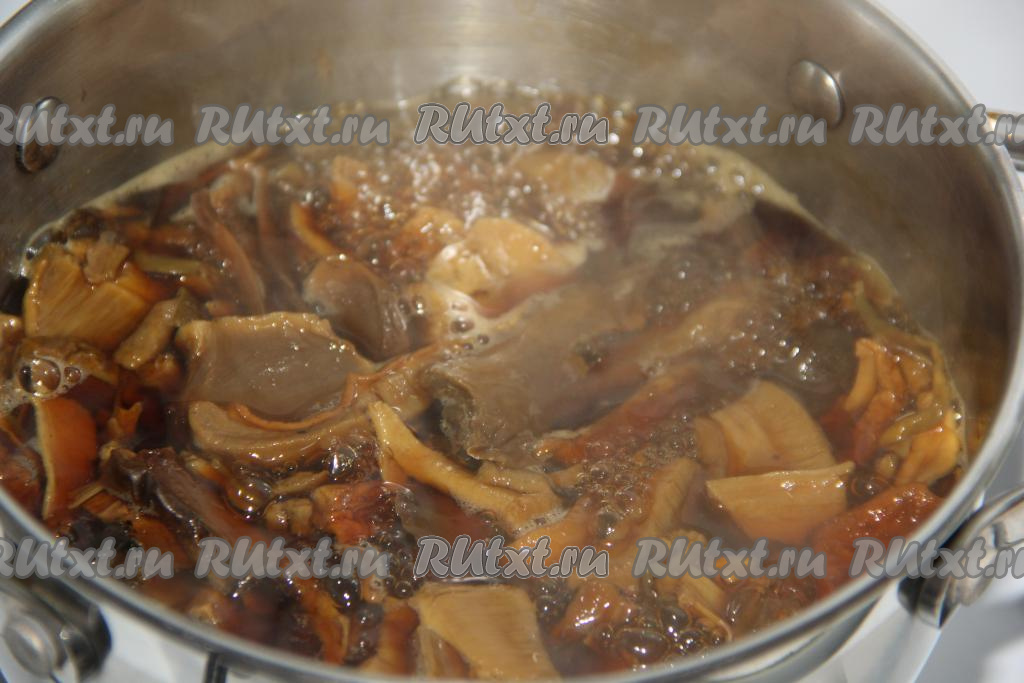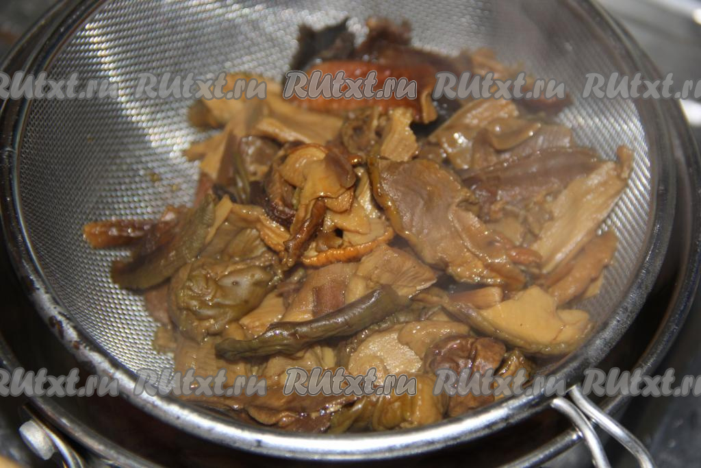 Откинуть отваренные грибы на дуршлаг и остудить. Отваренные сушёные грибы в дальнейшем обжаривать не надо, дайте им остыть, а затем нарежьте на длинные полоски с помощью ножниц. А вот если готовите салат с лесными грибами или с шампиньонами, их нужно обжарить на сковороде, разогретой с растительным маслом, в течение 10 минут, на среднем огне, не забывая периодически помешивать. Обжаренным грибам нужно дать остыть.