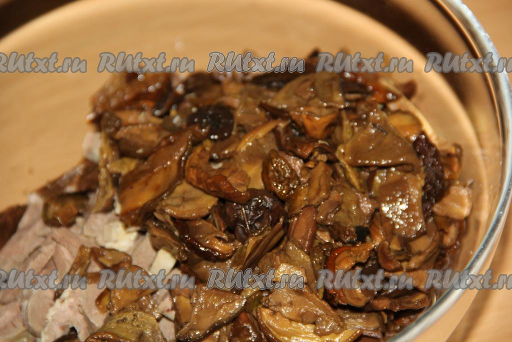 Для приготовления салата нужно заранее отварить свиное сердце, для этого нужно его хорошо промыть, выложить в кастрюлю, полностью залить водой и варить часа 2 с начала закипания воды на небольшом огне. Отваренное сердце остудить в бульоне. Теперь нужно заняться грибами. Если вы готовите салат с лесными грибами, их нужно перебрать, почистить, промыть водой, а затем крупные грибочки разрезать на несколько частей. Если готовите с шампиньонами, то их нужно промыть, а затем нарезать на пластины. Если готовите с сушёными грибами, то их нужно промыть под проточной водой. Свежие лесные грибы (или сушёные грибочки) полностью залить водой и отварить в течение 30 минут с момента закипания. Шампиньоны предварительно отваривать не нужно.