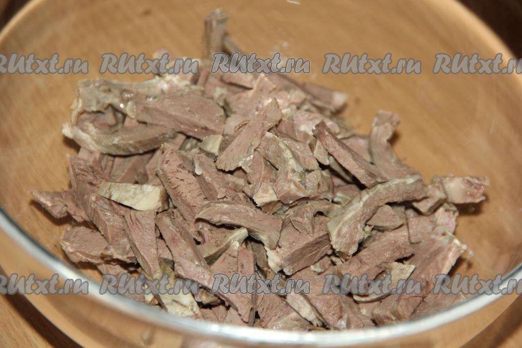 Остывшее варёное сердце достать из бульона и нарезать на брусочки.