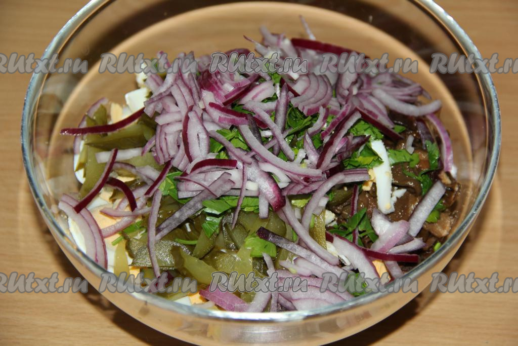 Луковицу почистить и нарезать на тонкие полукольца. Петрушку вымыть, мелко нарезать. Добавить лук и петрушку в салат.