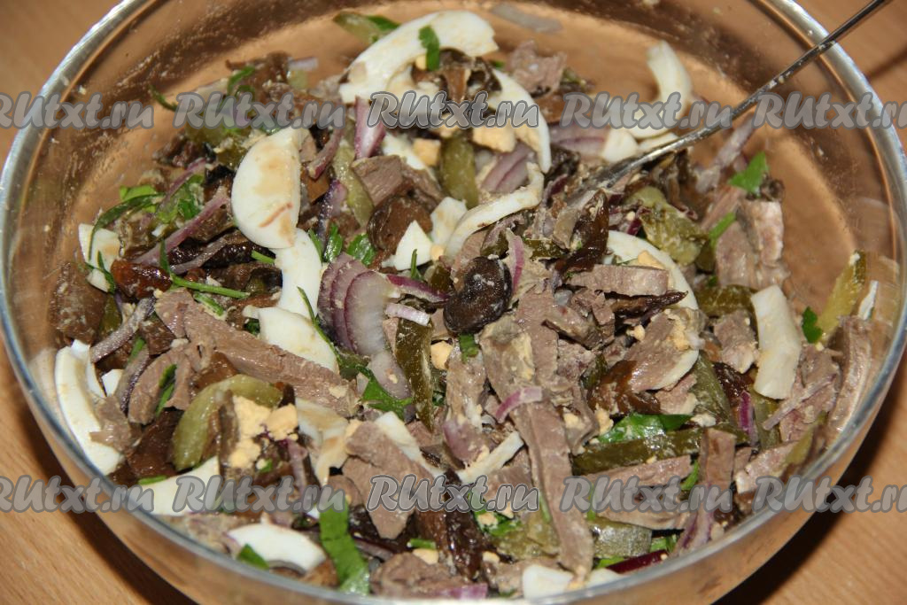 Салат, приготовленный с свиным сердцем, яйцами, огурцами и грибами, заправить майонезом непосредственно перед подачей и перемешать. Всем советую рецепт этого очень вкусного и сытного салатика!