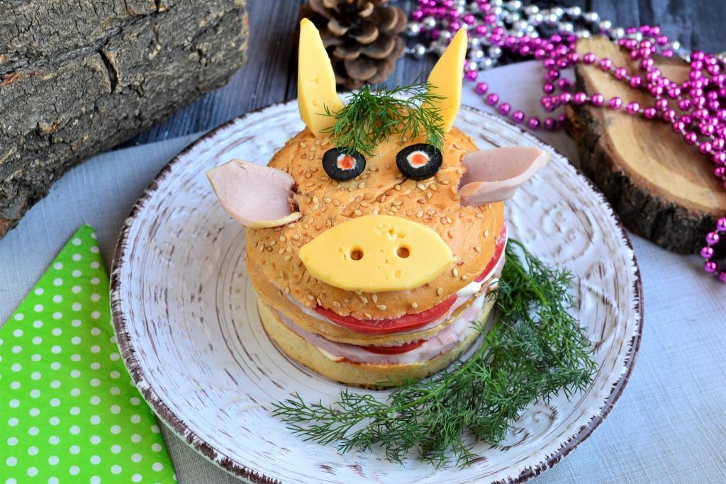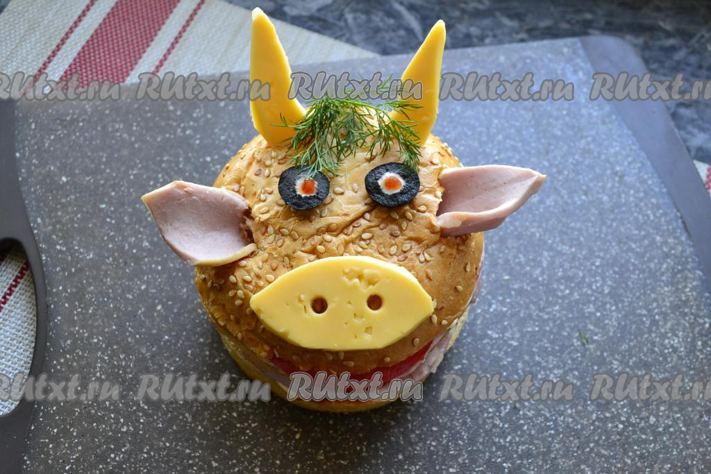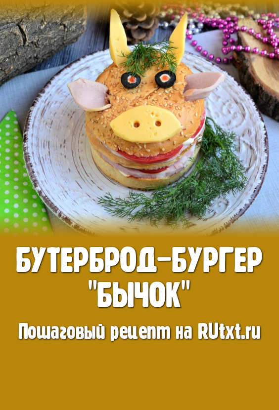 Наступающий Новый 2021 год - год Металлического Быка и рекомендуется на новогодний стол приготовить блюдо в виде этого животного. Можно украсить салат или испечь печенье, а я предлагаю вместе с детками сделать интересный и комичный бутерброд-бургер "Бычок" и разместить его в центре стола - будет очень символично. Также отлично будет сделать такие бутерброды на следующий день после встречи Нового года. Продукты для этого бутерброда нужны самые простые, здесь главное - украсить. Ну а то, что бутерброд "Бычок" вкусный и не сомневайтесь!