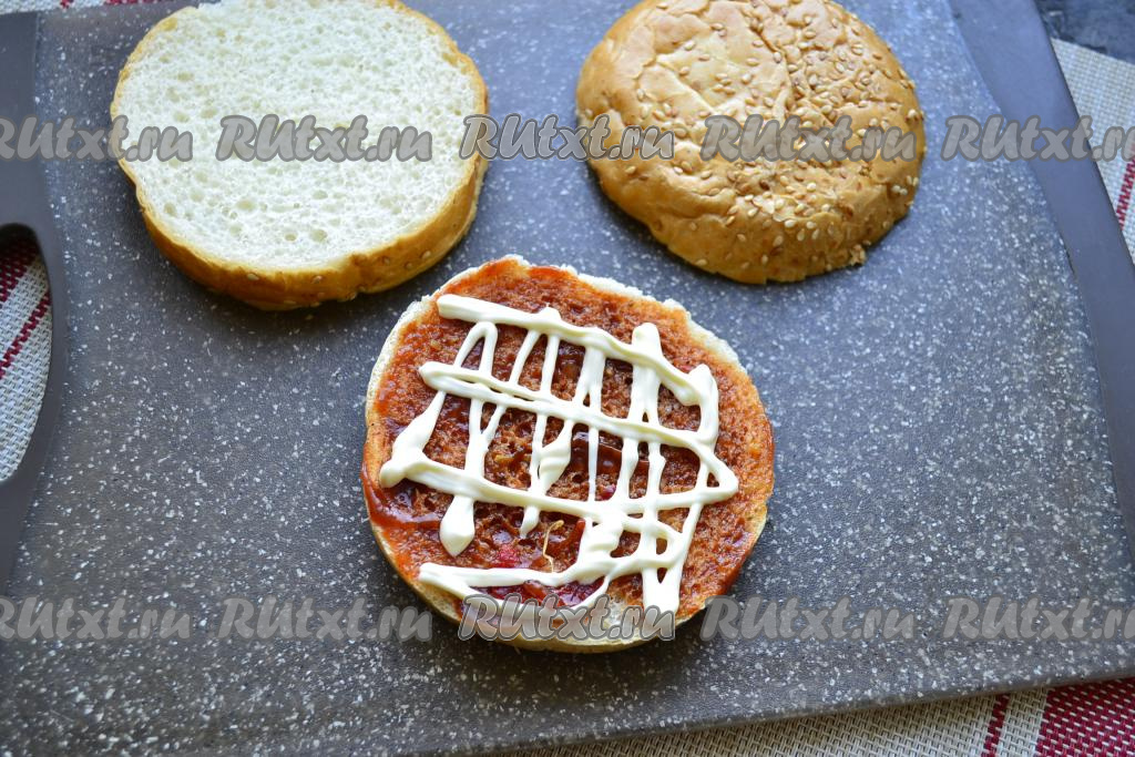 Нижнюю часть булочки смазать томатным соусом и майонезом.