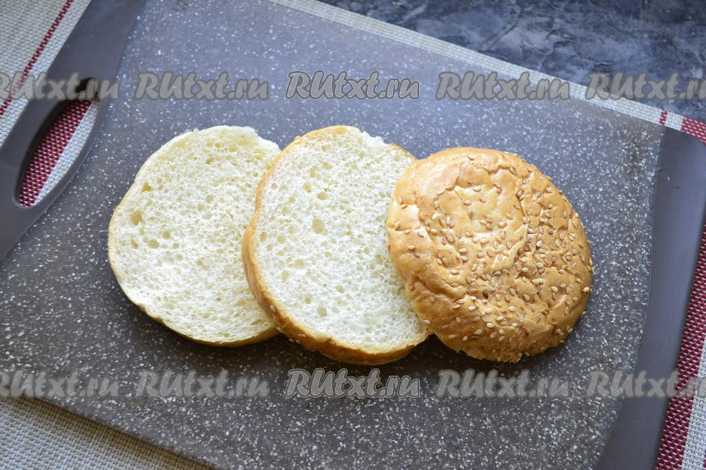 Булочку для гамбургера разрезать горизонтально на 3 части.