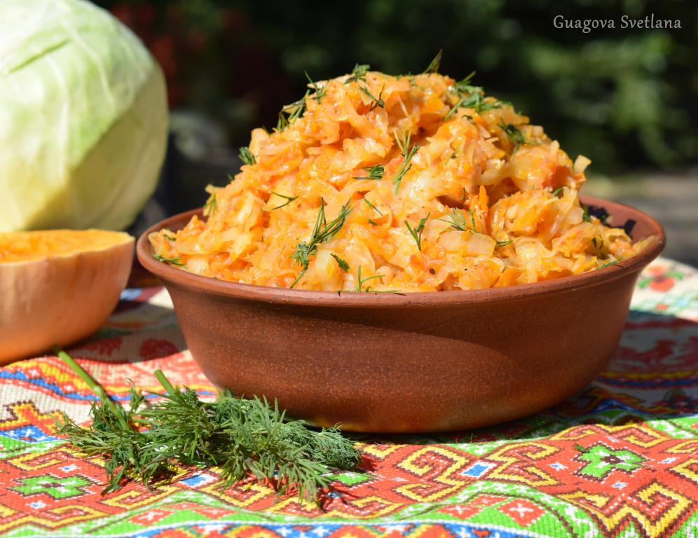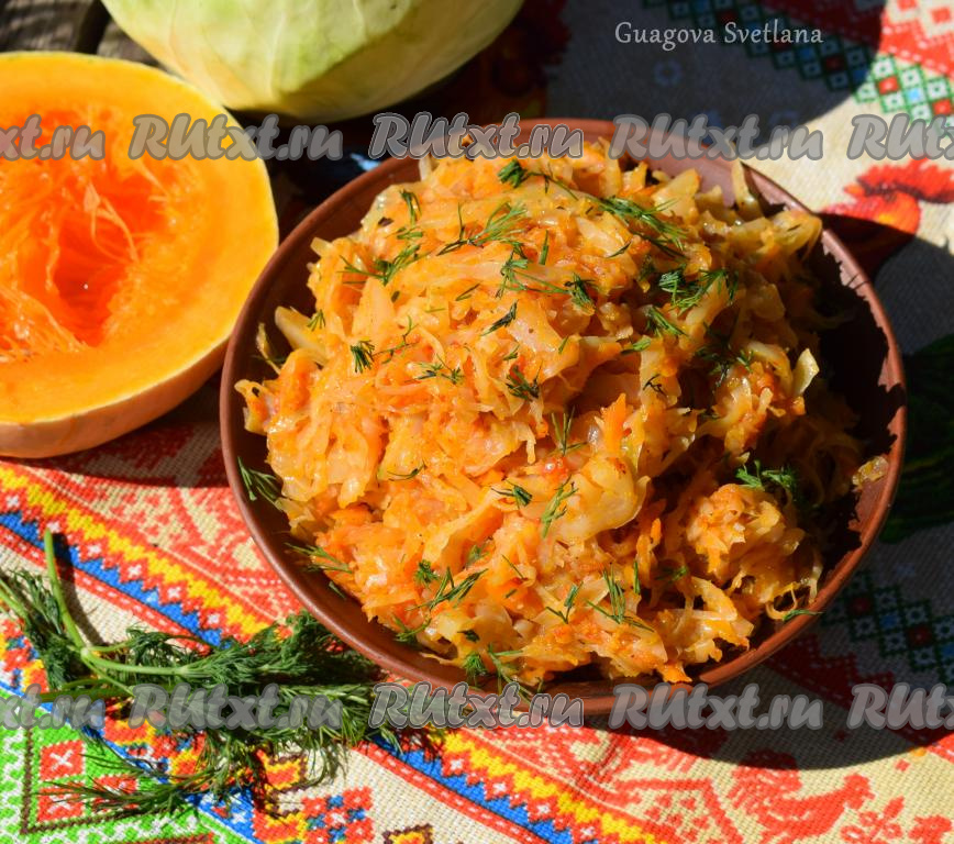 Если вы хотите приготовить вкусное и полезное овощное блюдо, тогда воспользуйтесь этим рецептом. Капуста, тушёная с тыквой, получается мягкой, вкусной. Овощи, приготовленные по этому рецепту, можно подать к столу и как самостоятельное блюдо, и в качестве гарнира к мясу, а можно использовать в качестве начинки для пирожков и пирогов. Это аппетитное постное блюдо, наверняка, понравится многим!