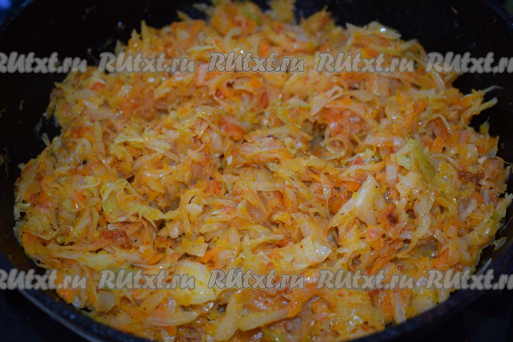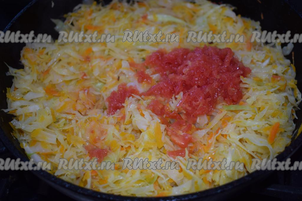 Когда овощи осядут и станут прозрачными, добавляем помидоры без кожицы, натёртые на крупной тёрке, перемешиваем и тушим ещё минут 5 под крышкой. Капуста с тыквой должны стать мягкими.