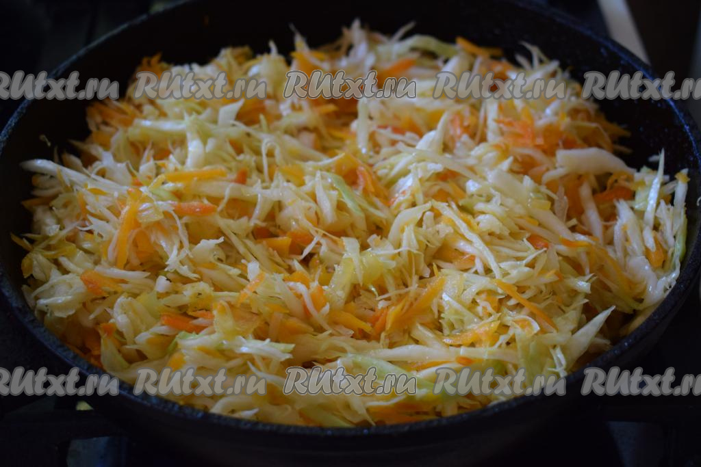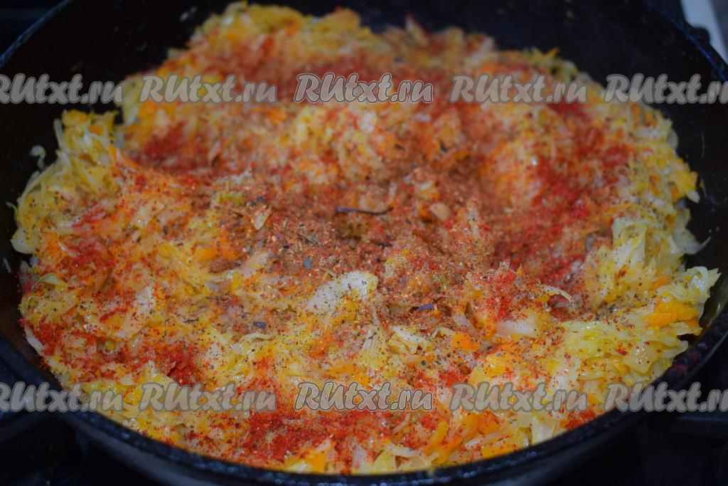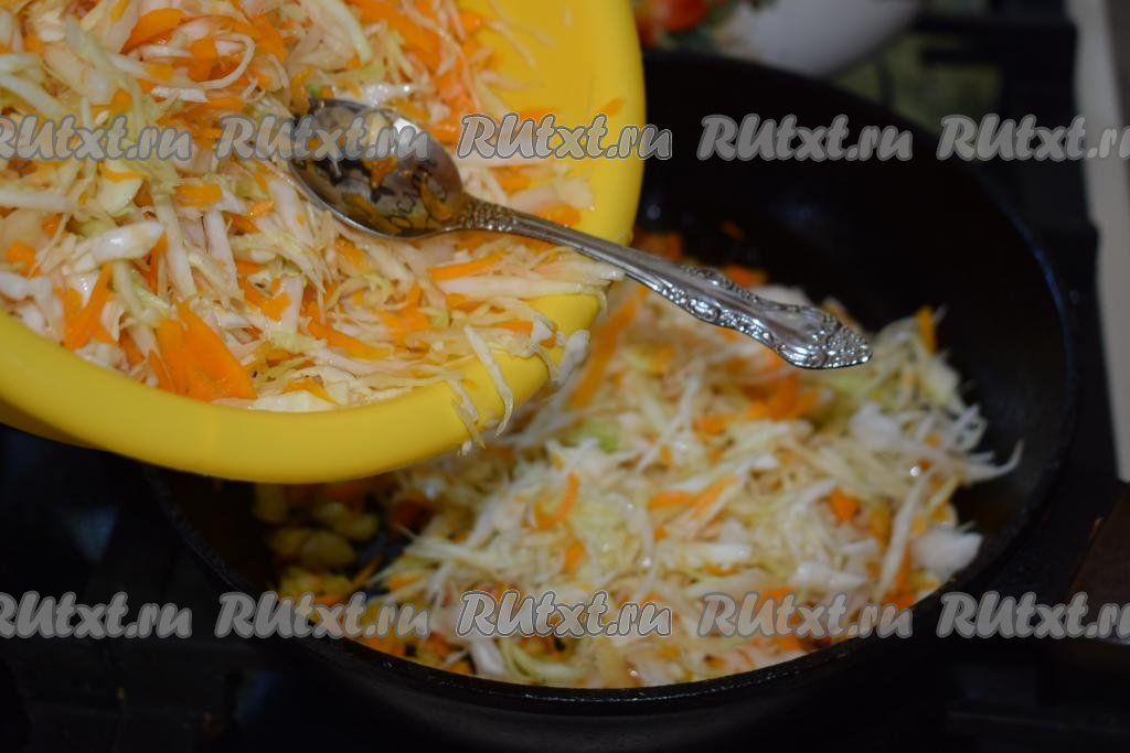 Далее в несколько приёмов к обжаренным овощам добавляем капусту с тыквой, каждый раз хорошо перемешивая (при таком способе добавления вам будет легче перемешивать овощи на сковороде и капуста с тыквой не будет падать на плиту).