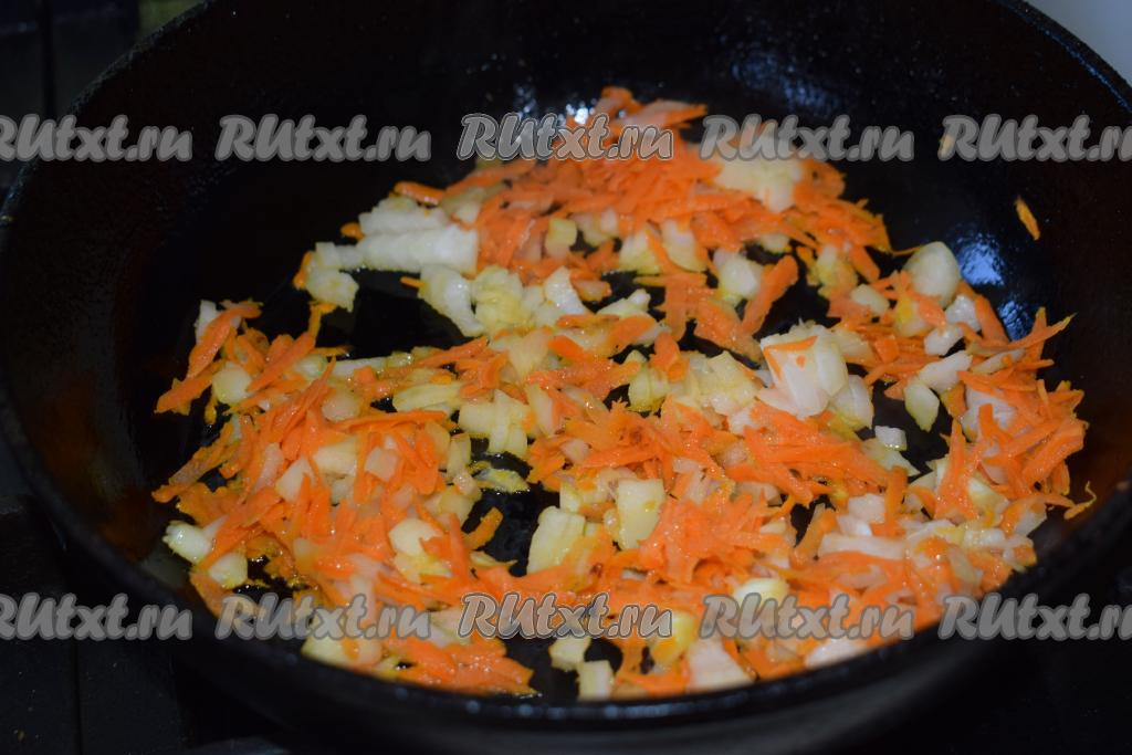 В сковороде разогреем растительное масло, выкладываем лук с морковью и обжариваем их на среднем огне до прозрачности овощей (примерно, 8-10 минут).