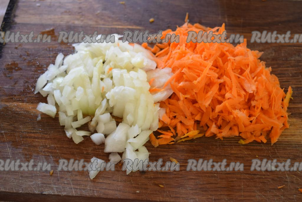 Морковь натрём на крупной тёрке. Лук нарежем на мелкие кубики.