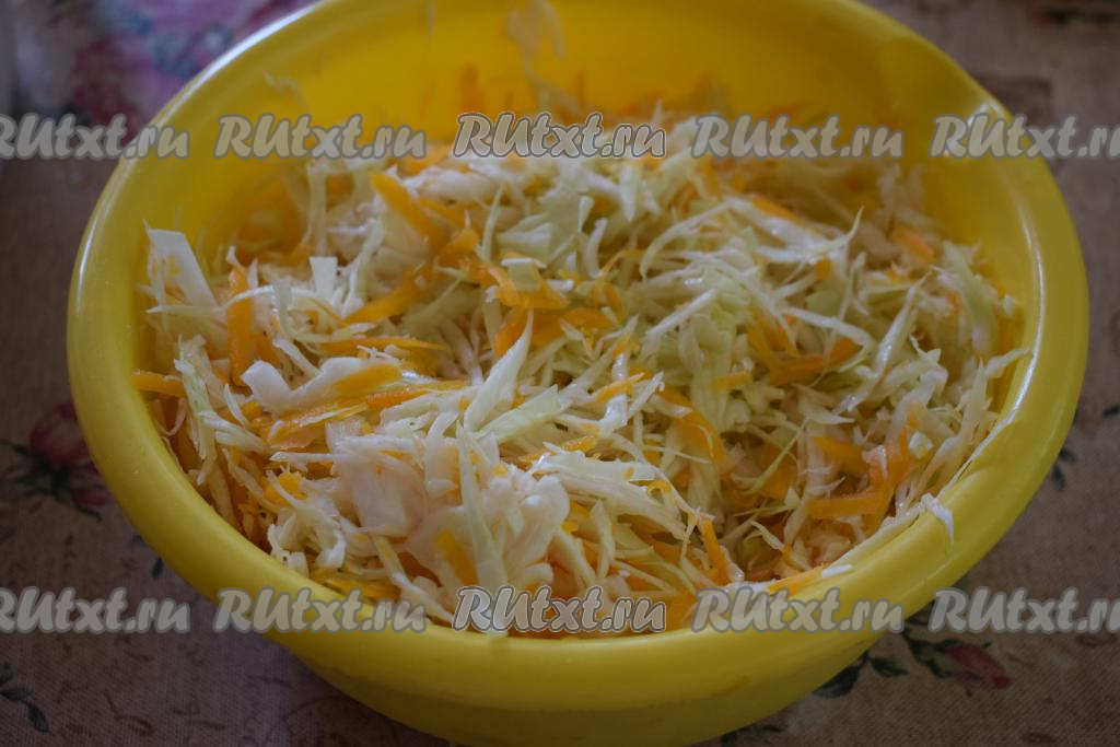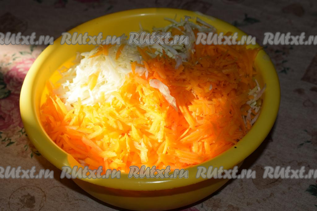Натрём тыкву на крупной тёрке и добавим в миску с капустой.