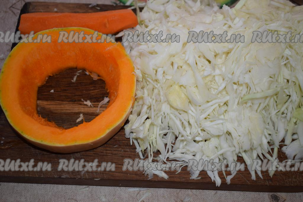 С капусты удалим порченые листья, морковь и лук очистим от кожицы. Капусту нашинкуем очень тонко и сложим в глубокую миску. Кусочек тыквы очистим от кожуры и семян (нам потребуется 200-250 грамм очищенной тыквы).