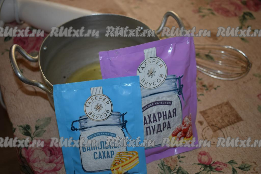 Пока пирог печётся, приготовим белковый крем. Для этого добавляем к охлаждённым белкам ванильный сахар и начинаем взбивать миксером в пышную пену.