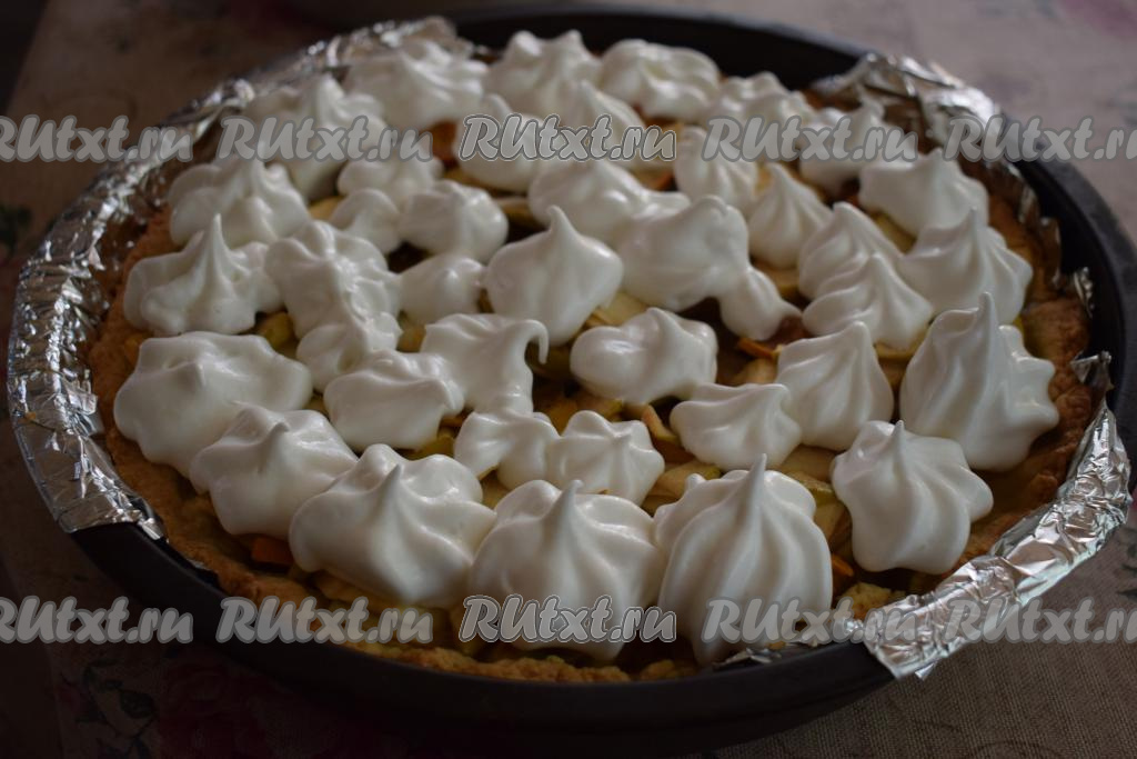 Вынимаем из духовки пирог с яблоками и хурмой. На его поверхность начинаем наносить белковый крем, отсаживая звёздочки (крем можно аккуратно разложить по верху пирога и с помощью ложки, обойдясь без кулинарного мешка и насадок).