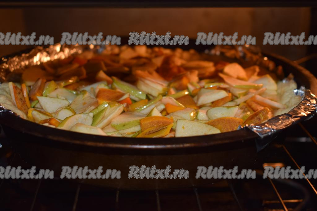 Выкладываем нашу фруктовую начинку на тесто, равномерно распределяя её по всей поверхности пирога.