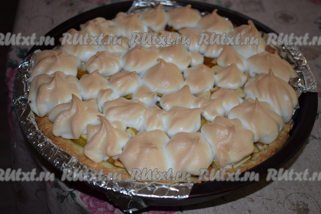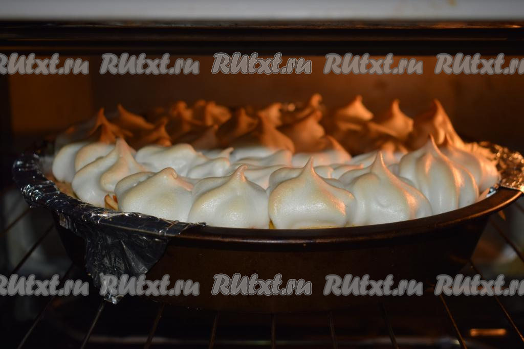 Следим за пирогом, и как только наш белковый крем начнёт становиться красивого кремового цвета, достаём выпечку из духовки.