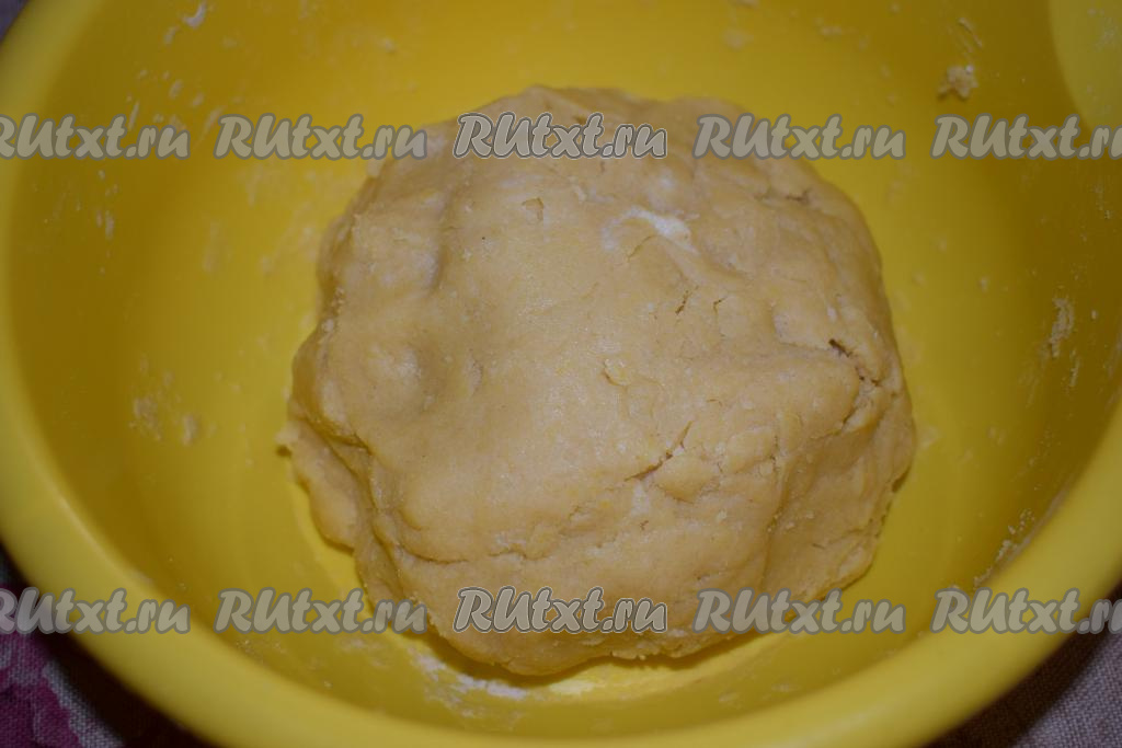У нас должна получиться лёгкая, воздушная крошка. Добавляем к крошке разрыхлитель, сметану и замешиваем плотное песочное тесто.