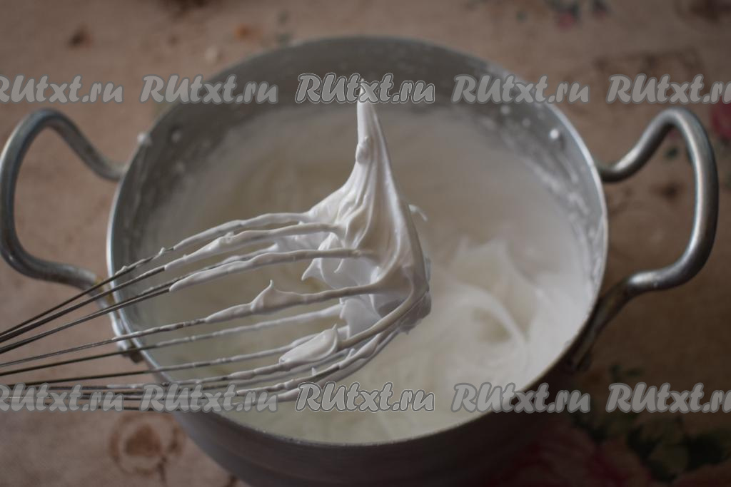Затем порциями всыпаем в миску с белками сахарную пудру и продолжаем взбивать белки до плотной, блестящей массы. Белки должны получиться очень плотными, не стекать, а крепко держаться на венчике. Наш белковый крем готов. Перекладываем его в кулинарный мешочек с насадкой.