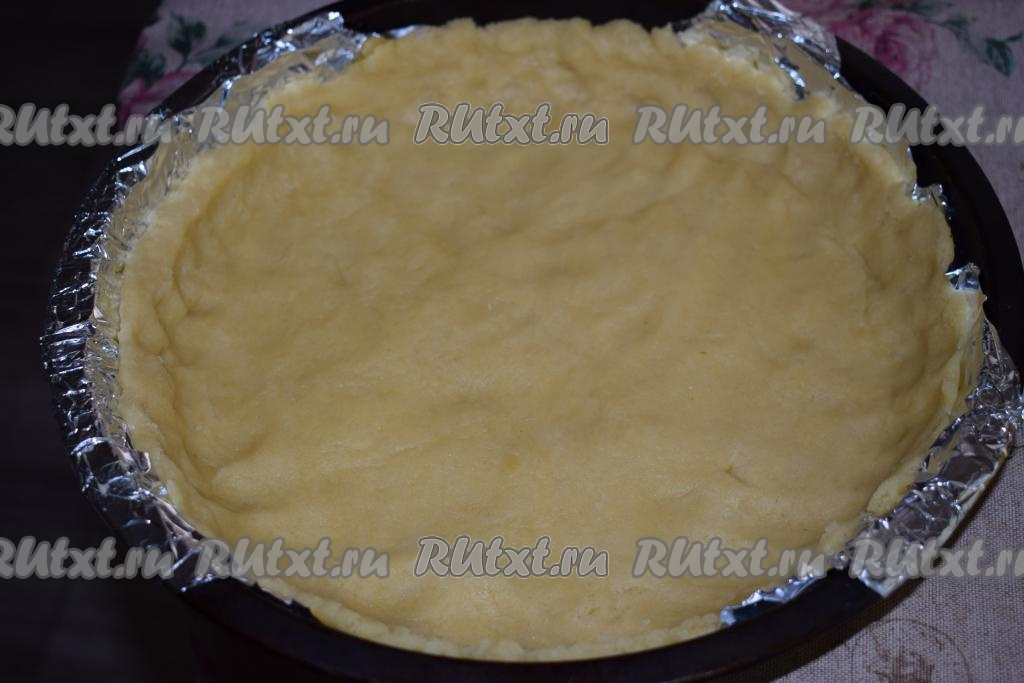 Достаём охлаждённое тесто и распределяем его по форме, которую предварительно застилаем фольгой (или пергаментом). Формируем высокие бортики. Диаметр моей формы 28 см.