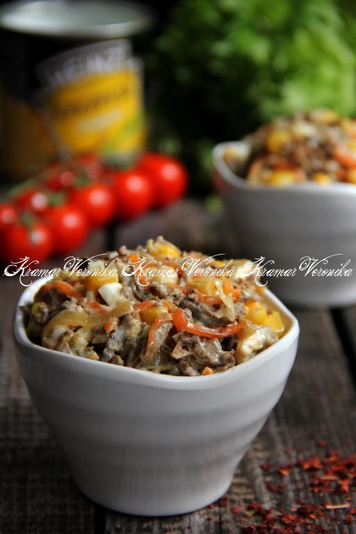 Кукурузу без жидкости тоже добавить в печёночный салат, посолить по вкусу и очень хорошо перемешать. Заправить майонезом и снова перемешать.