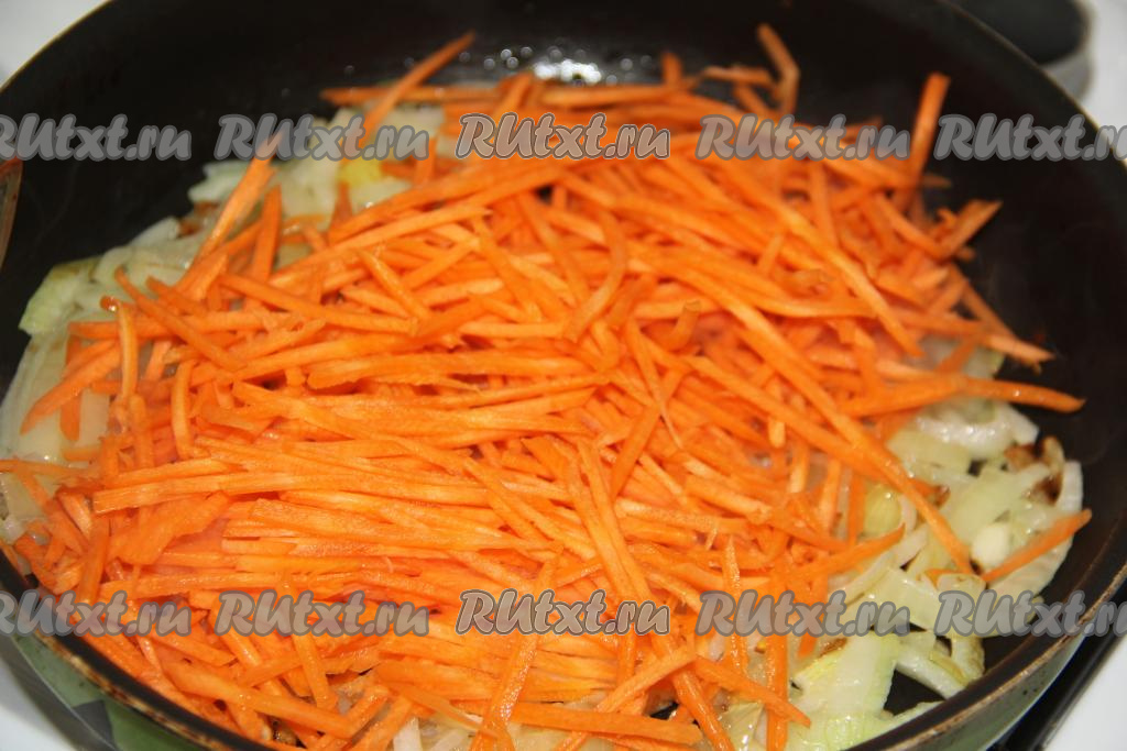 Морковь почистить, а затем натереть на крупной тёрке и выложить на сковороду к обжаренному луку.
