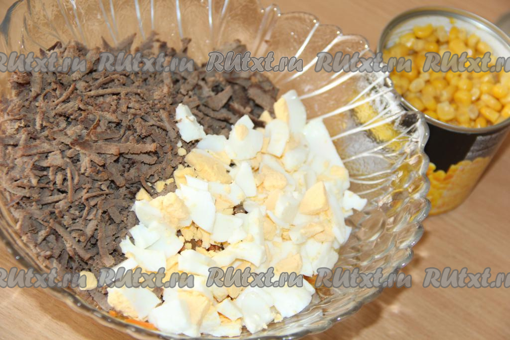 Яйца предварительно отварить вкрутую (варить минут 8-10 с начала кипения воды), остудить, почистить, мелко нарезать и выложить в салат из варёной свиной печени, морковки и лука.