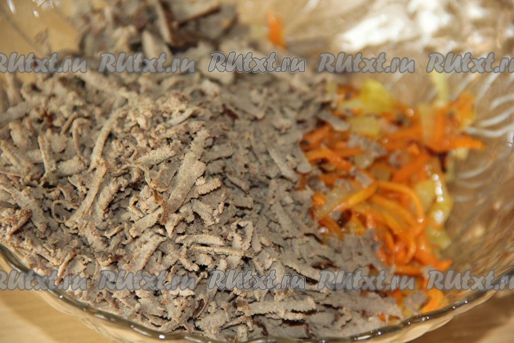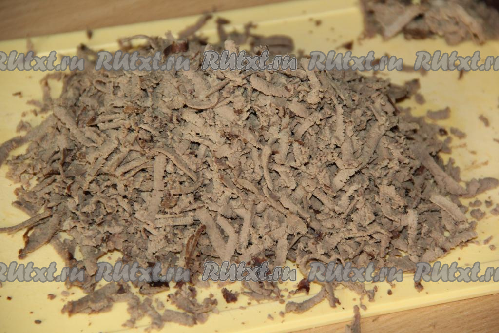 Остудить 200 грамм отваренной свиной печени, а затем натереть на крупной тёрке.