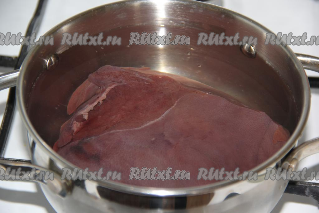 Заранее отварить свиную печень (я выложила кусок печени в кастрюлю, залила холодной водой, поставила на огонь и отварила в течение 10 минут с момента закипания воды).