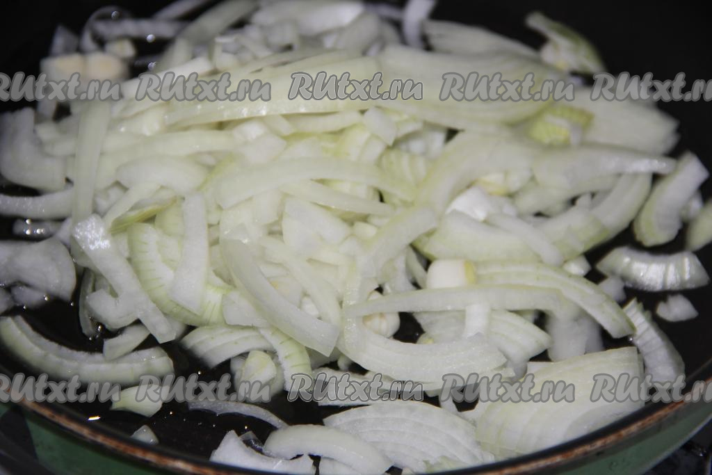 Лук почистить и нарезать тонкими полукольцами. В сковороду влить масло и добавить полукольца лука.