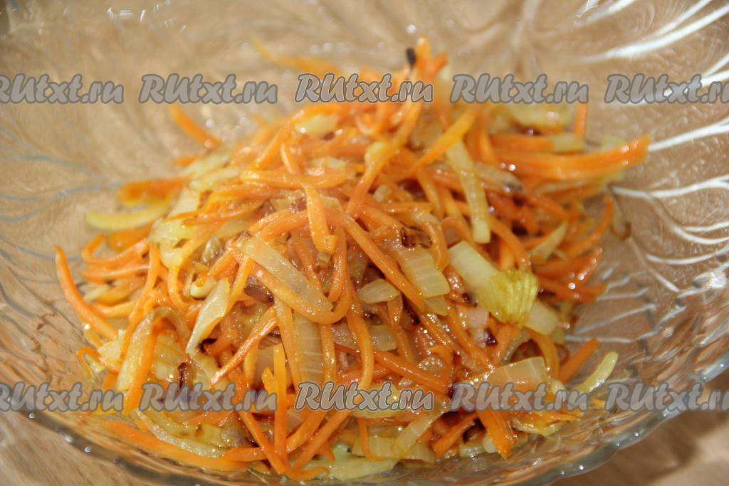 Обжарить овощи, помешивая, до мягкости морковки (на это потребуется минут 7). Снять сковороду с огня, дать луку с морковкой остыть и переложить в салатник.