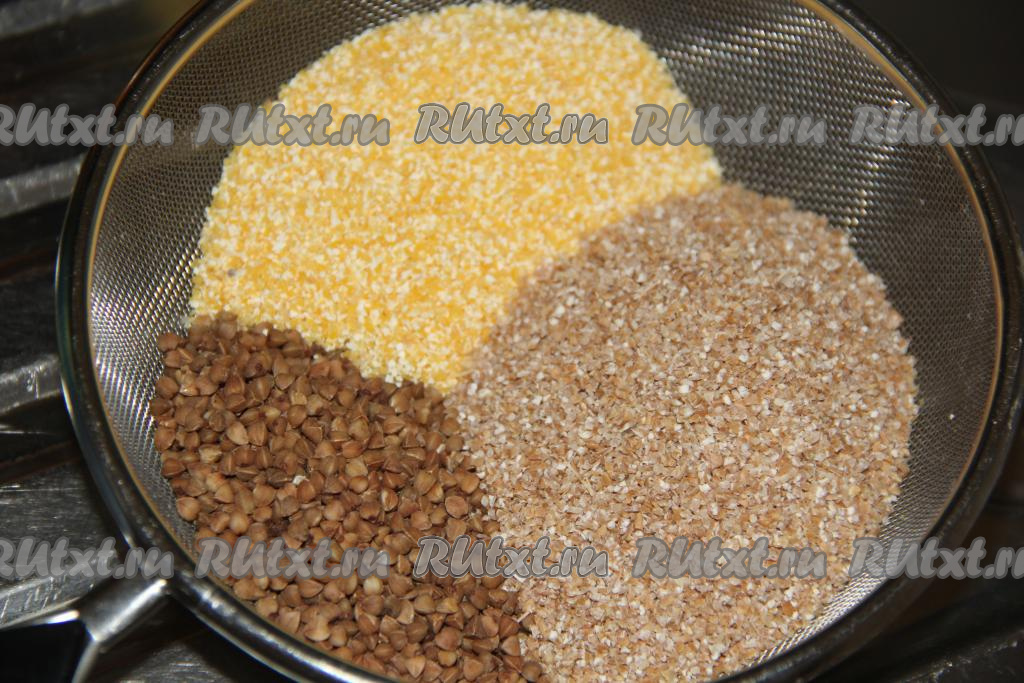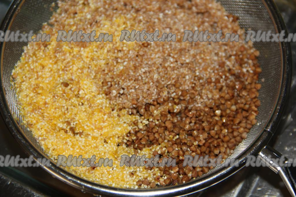 Если необходимо, гречку предварительно перебрать. Взвесить по 50 грамм гречневой, пшеничной и кукурузной крупы (всего для приготовления молочной каши потребуется 150 грамм крупы).
