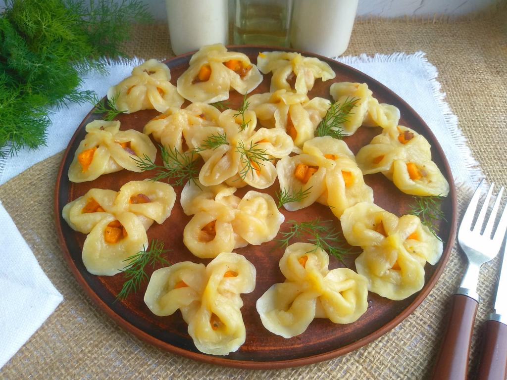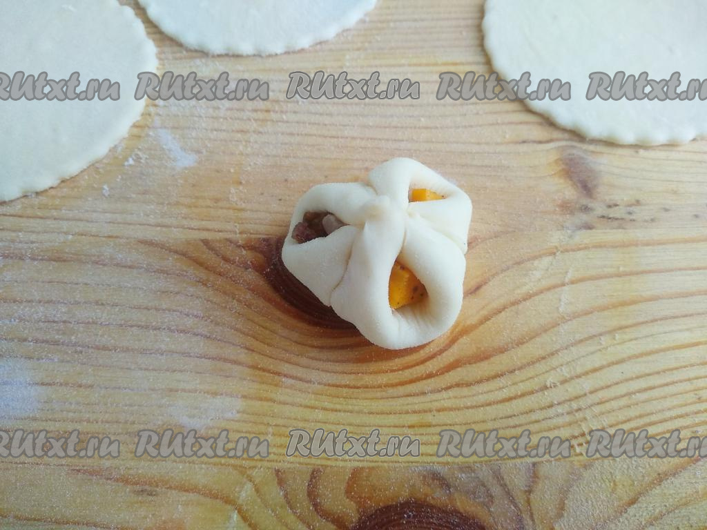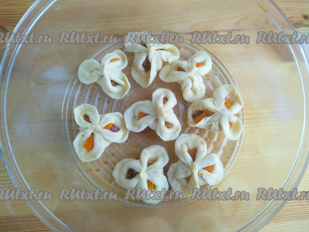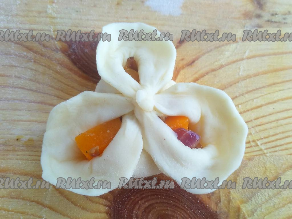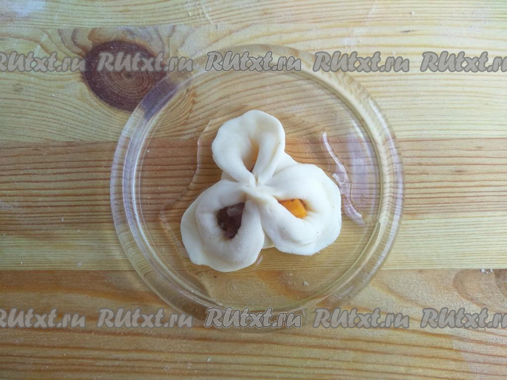 Расправить лепестки. Получается цветочек с тремя лепестками, как на фото. Аналогично вылепить остальные изделия. Из указанного количества ингредиентов получается 14-15 мантов с тыквой.
