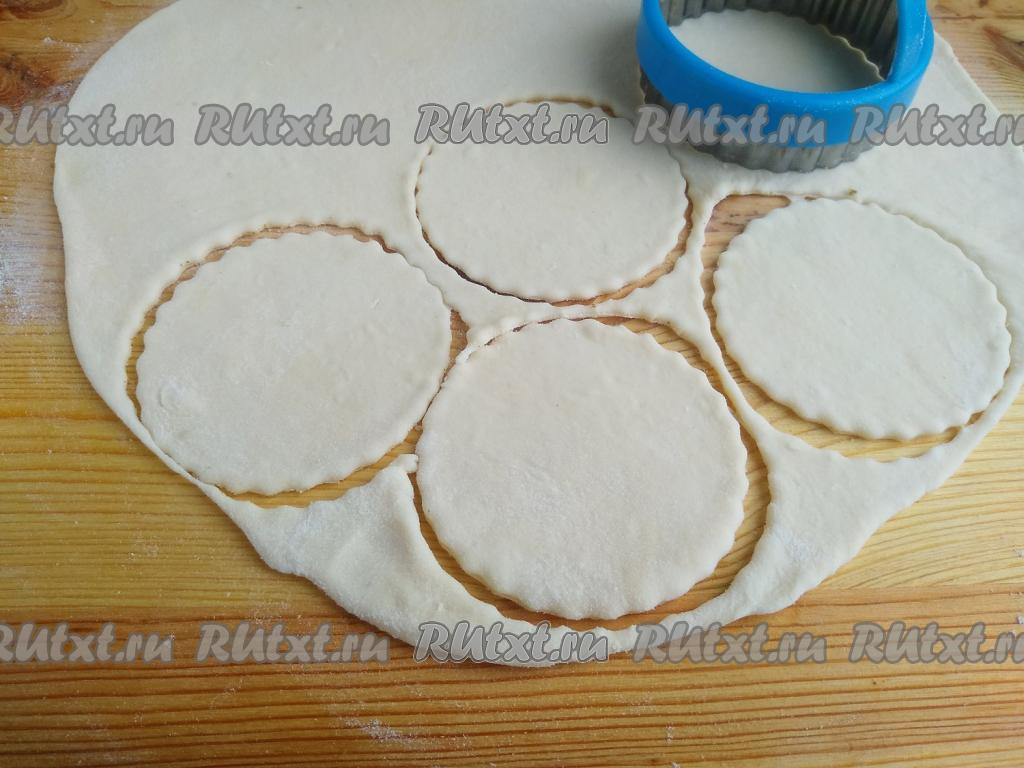 На столе, присыпанном мукой, раскатать тесто в пласт толщиной 2 мм. Выемкой (или стаканом) диаметром около 9-10 см вырезать кружки.