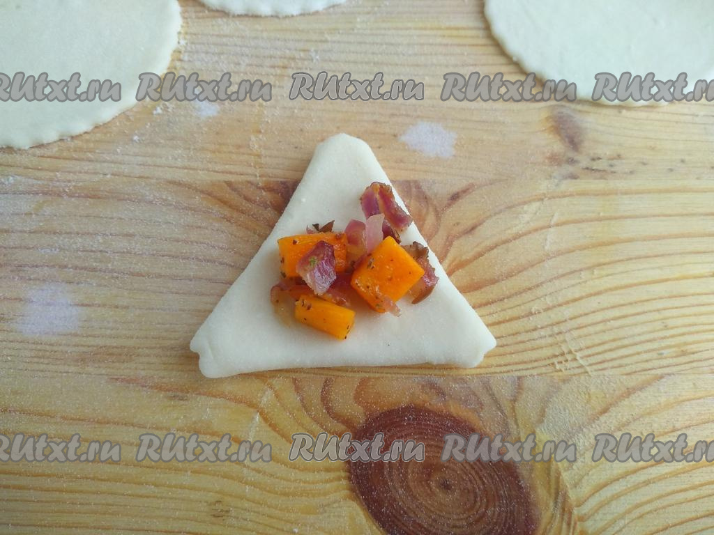 Перевернуть треугольник, выложить в центр 1 чайную ложку остывшей начинки из тыквы с луком.