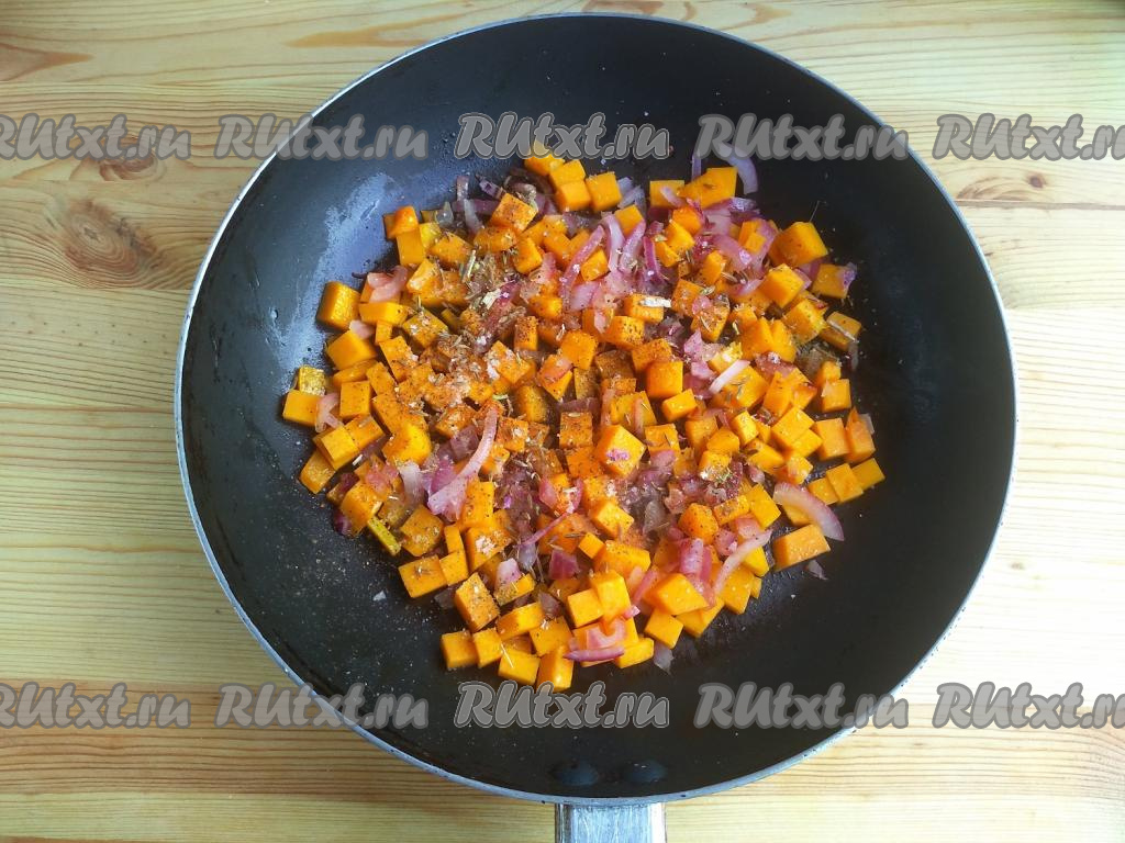На сковороду выложить тыкву и лук, влить растительное масло. Прогреть овощи в течение 2-3 минут на среднем огне, помешивая, добавить соль, чёрный молотый перец и специи (я добавила зиру и шалфей), перемешать начинку, снять с огня и охладить.