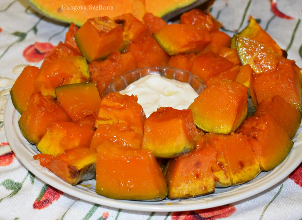Готовые кусочки тыкву достаём из духовки, перекладываем на блюдо для подачи и сверху поливаем наш десерт образовавшимся сливочно-сахарным сиропом. По желанию, ставим розеточку со сметаной в центр тарелки. Мягкую, сладкую тыкву, запечённую с сахаром, подаём к столу в тёплом или в остывшем виде. От этого десерта с приятным сливочным вкусом вряд ли кто-то откажется, так что готовьте побольше!