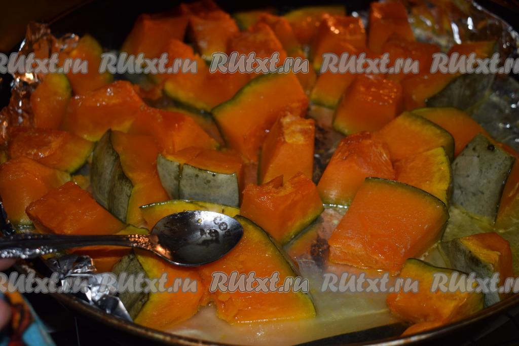 Готовность тыквы проверяем, пробуя кусочек на вкус (тыква должна стать мягкой и пюреобразной). Время запекания зависит от сорта тыквы, величины нарезанных кусочков и конечно же от вашей духовки, поэтому следим за тыквой во время запекания.