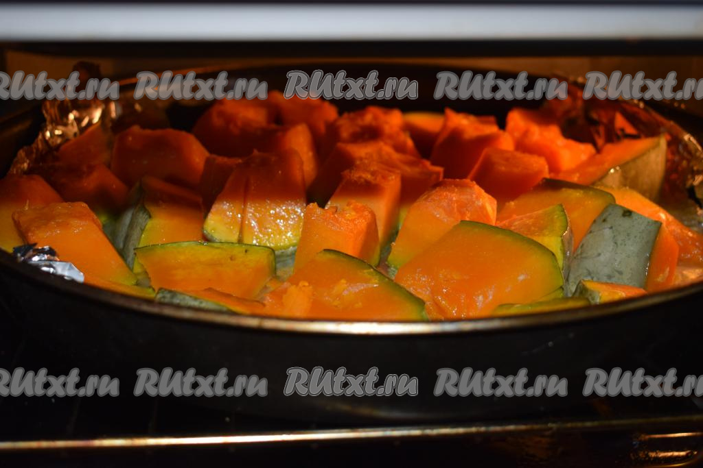 Далее достаём форму, переворачиваем кусочки тыквы на другую сторону и снова отправляем в духовку. Продолжаем запекать тыкву ещё 15-20 минут