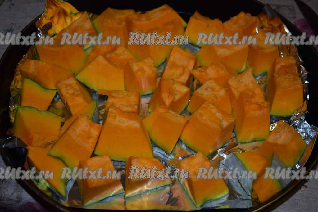 Тыкву, не очищая от кожуры, нарезаем на кусочки, примерно, равного размера. Форму для запекания (или противень) я застилаю фольгой, но можно этого и не делать. В форму (или на противень) выкладываем кусочки тыквы в один слой.