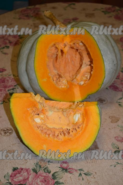Тыкву вымоем и отрежем от неё кусок нужного размера, семена удаляем.