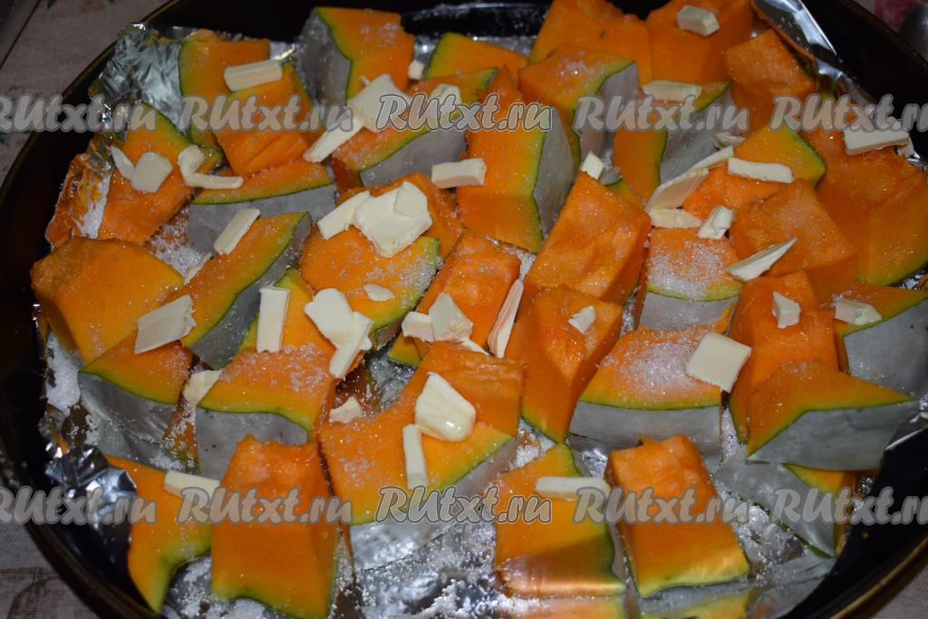 Посыпаем тыкву сахаром и раскладываем поверх кусочков нарезанное на кубики сливочное масло. Наливаем на дно формы воду. Количество воды может отличаться от указанного в рецепте (количество воды зависит от размера выбранной вами формы, вода должна еле-еле покрывать дно формы). Вода нужна для того, чтобы тыква пропарилась, но не варилась в ней.