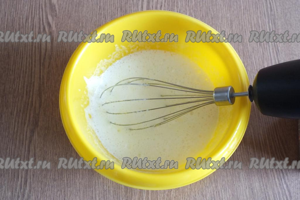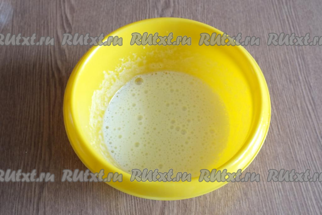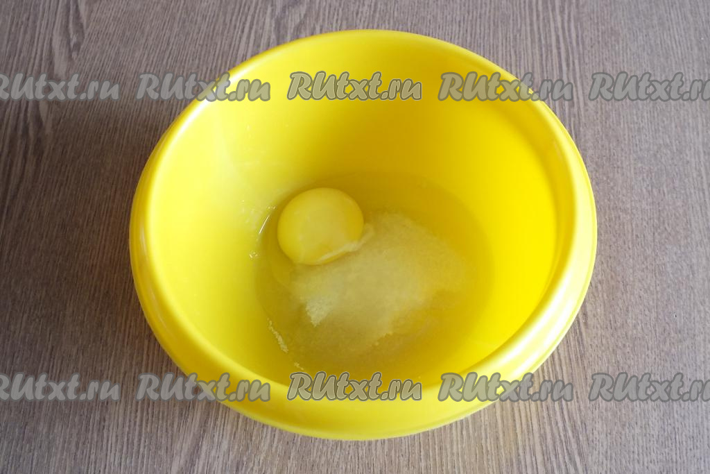 Яйцо с сахаром с помощью миксера взбейте в миске в пышную, белую массу.