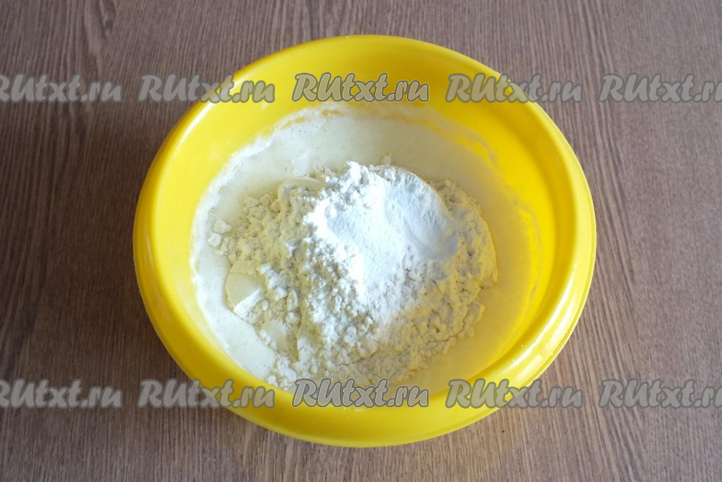 В получившуюся смесь всыпьте муку и разрыхлитель для теста.
